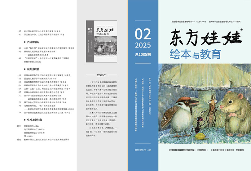 《东方娃娃绘本与教育》(月刊)创刊于2010年,多年来杂志内容及形式方面与时俱进,并以其形式和内容的丰富性及多样性,赢得了不同阶层读者的喜爱与拥护。是一本立足于东方文化沃土、面向当代儿童成长需求的综合性教育期刊。它以传承中华优秀传统文化为核心使命,巧妙融合现代教育理念与儿童发展心理学,通过绘本、故事、游戏、互动活动等多种儿童喜闻乐见的形式,构建了一个寓教于乐、润物无声的文化启蒙与美育平台。杂志自创刊以来,始终秉持“以文化人、以美育人”的办刊宗旨,致力于在儿童心中播下中华文化的种子,培养具有文化自信、审美能力和创新精神的新时代小公民。